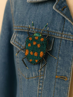 Este accesorio bordado a mano representa un majestuoso insecto lleno de vida y color. Cada cristal y mostacilla ha sido cuidadosamente elegido y bordado a mano para dar forma a un diseño vibrante en tonos verdes, turquesa y destellos anaranjados que evocan la energía de los bosques y el resplandor de las joyas naturales.