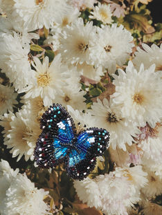 Para este accesorio me inspiré en las mariposas del género Morpho. Sus hermosos colores azules y negros los repliqué haciendo uso de hilos, toletes y chaquiras. Puede ser usado como broche, aretes, collar, anillo, entre otros.